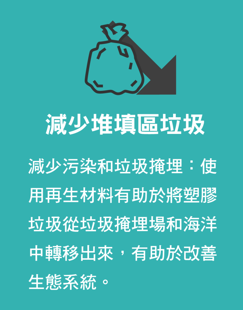 減少污染和垃圾掩埋:使用再生材料有助於將塑膠垃圾從垃圾掩埋場和海洋中轉移出來,有助於改善生態系統。